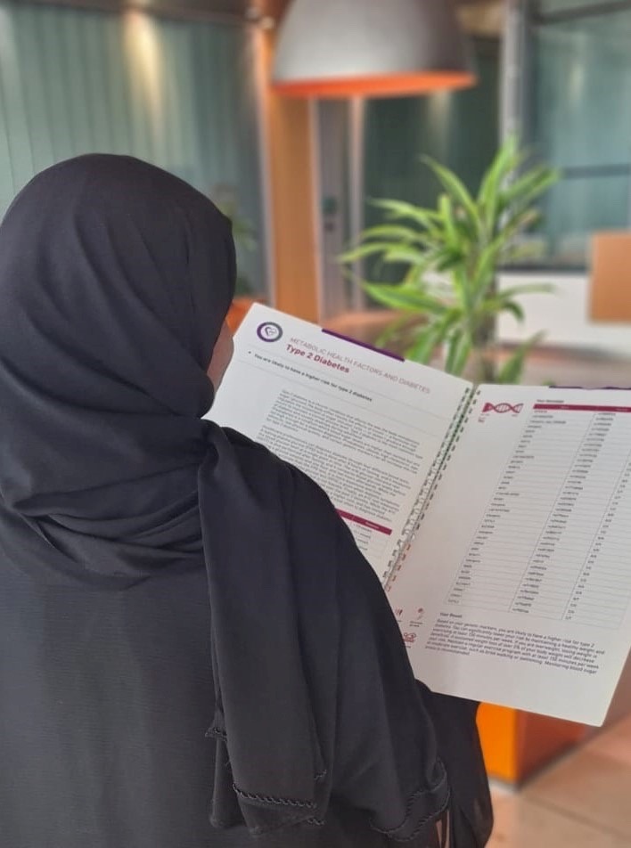 | من أهم مبادرات المعهد إعادة تقارير الجينومية المتعلقة بالصحة ونمط الحياة إلى المشاركين. وتهدف هذه المبادرة إلى سد الفجوة المعرفية لدى أفراد المجتمع المحلي فيما يتعلق بالمعلومات الجينية وارتباطها بخصائص الصحة ونمط الحياة. ويُزوَّد المشاركون في هذا التقرير المخصَّص بمعلومات عن استعداداتهم الجينية تجاه 29 سمة مختلفة، منها السمنة، وسلوكيات الأكل، وردود الفعل تجاه الطعام، وممارسة الرياضة، ومستويات الكوليسترول، وداء السكري من النوع الثاني. وقد بدأ المعهد بتقديم هذه النتائج، بالتعاون مع الأطراف المعنية، مستفيدًا من المعرفة المستقاة من الأبحاث الحديثة التي أُجريت وقتَ تصميم التقارير. وإلى جانب التوعيه في مجال الاستشارة الجينية، تُمكِّن هذه التقارير المشاركين من اتخاذ قرارات مستنيرة لتبني الخيارات المناسبة لنمط حياة صحي. |